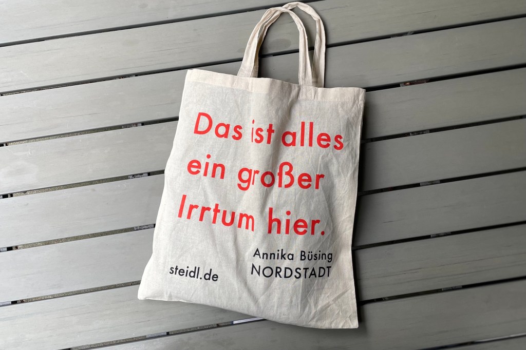 „Das ist alles ein Irrtum hier“: In der wunderschönen Buchhandlung Markus in meiner Heimatstadt Gütersloh schenkte man mir im April eine Leinentasche mit diesem Aufdruck. Mein Monatsgefühl.