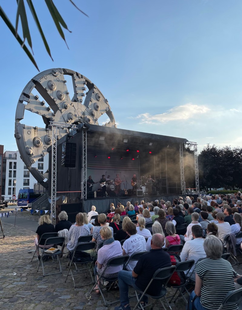 Mein Konzert des Monats knüpfte sehr gut an das Buch von Joachim Henschel an, wie gut, ist mir erst im Nachhinein klar geworden. Es gab einen Auftritt der aus dem Film „Gundermann“ entstandenen Band „Alexander Scheer | Andreas Dresen & Gundermann“ in Hamburg – und es war ein großartiger Abend. Ich habe das jetzt zum dritten Mal gehört, das Programm ist jedes Mal nahezu (?) identisch, die Kulissen könnten unterschiedlicher nicht sein: 2020 im Schauspielhaus in Hamburg, 2021 Open Air auf Usedom und nun erneut Open Air, vor der riesigen Trude, dem Schneiderad des Elbtunnelbohrers, am Museum der Arbeit in Hamburg.