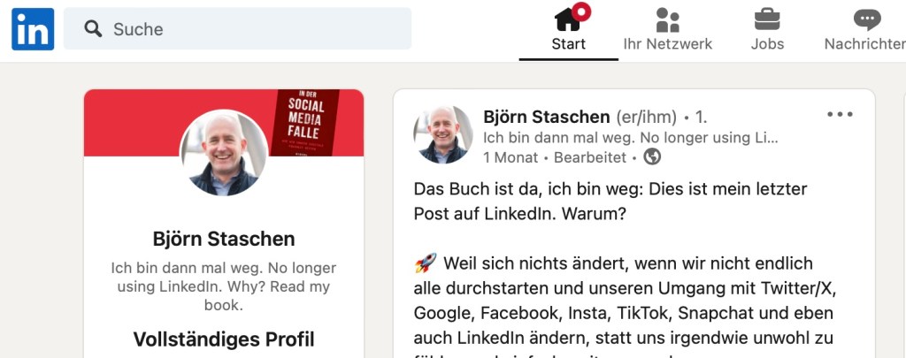 Der Journalist, Autor und Medienwissenschaftler Björn Staschen hat ein Buch geschrieben, mit dem er vor der Auflösung des freien, meinungsbildenden Diskurses warnt. Entdeckt habe ich den Hinweis auf „In der Social-Media-Falle“ auf einer der Social-Media-Plattformen, die er für diesen drohenden Verlust verantwortlich macht. Björn Staschen, der bis vor Kurzem noch recht aktiv auf LinkedIn kommunizierte, wird in Zukunft weder dort noch auf Instagram, X oder Facebook über sein Buch diskutieren. Denn zum Erscheinungstag hat er sich Ende September von allen Kanälen verabschiedet – mit Ausnahme von Mastodon und Bluesky. Er ging mit dem Hinweis, man solle sein Buch lesen, um zu verstehen, warum. Eine konsequente Schlussfolgerung aus dem eigenen Text.