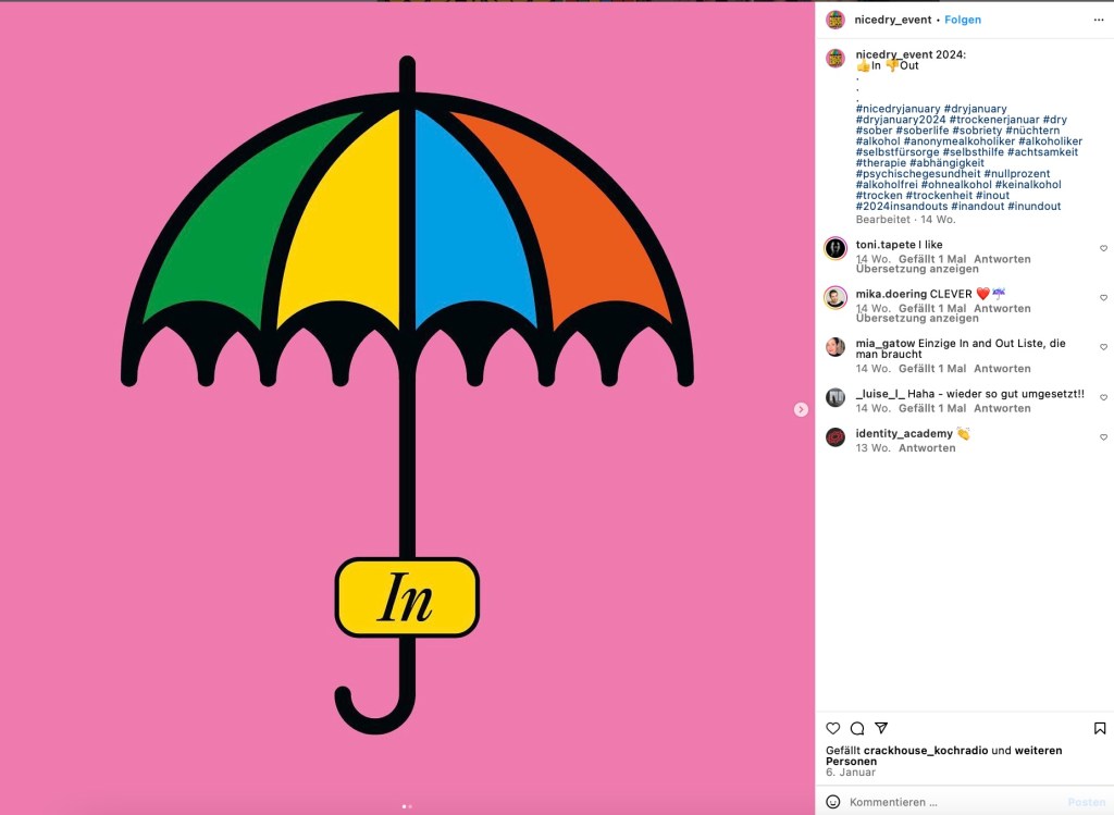 Hamburg hatte im Januar sein erstes „Nice Dry!“- Event (der Link führt zu Instagram) – ein Festival, das die Nüchternheit feiert. Initiiert hat das Ganze Maurice Rieger, der seit Anfang April bei uns in der Agentur das Design-Team erweitert. Im März habe ich mir den Podcast zum Event angehört. Ich empfehle das allen weiter, die Interesse daran haben, mehr darüber zu wissen, wie Menschen heute anders über Alkohol denken als es in der Generation von Til Schweiger (meine Generation …) noch vorherrschende Meinung war und ist. Ich mag es, wie das Nüchternsein als Gewinn gefeiert wird, statt den Verzicht zu beklagen.