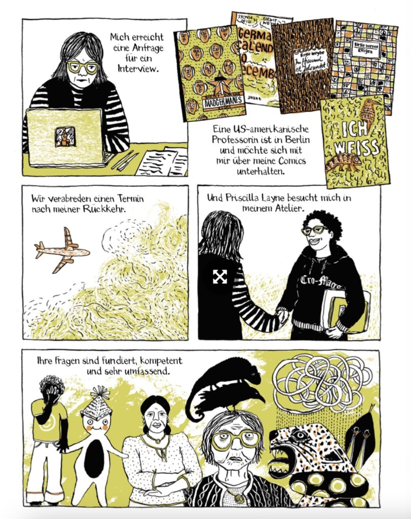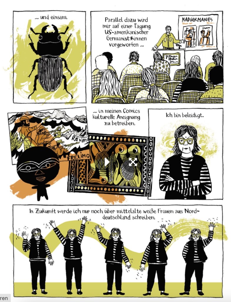 Anfang April habe ich zum ersten Mal erlebt, wie eine Autorin einen Comic vorliest: Birgit Weyhe hat bei einer einer Wohnzimmerlesung mit Beamer ihre neue Graphic Novel „Rude Girl“ präsentiert. Beides, Veranstaltungsort und -format, haben mir sehr gefallen. Es entsteht ein ganz anderer Eindruck, wenn die Bilder über Beamer projiziert werden und die Autorin die Texte dazu liest. Birgit Weyhe stellte sich zu Anfang mit ihrem Lebenslauf mit selbst gezeichneten Bildern selbst vor. Schon da konnte man erkennen, dass sie neben internationaler Erfahrung (sie verbrachte ihr Kindheit und Jugend in Uganda und Kenia) vor allem auch einen ganz besonderen Humor mitbringt, der Text und Zeichnungen ihrer Arbeiten prägt. Was besonders ist: Sie reflektiert das eigene Erzählen und macht sie zum Teil der Geschichte.
