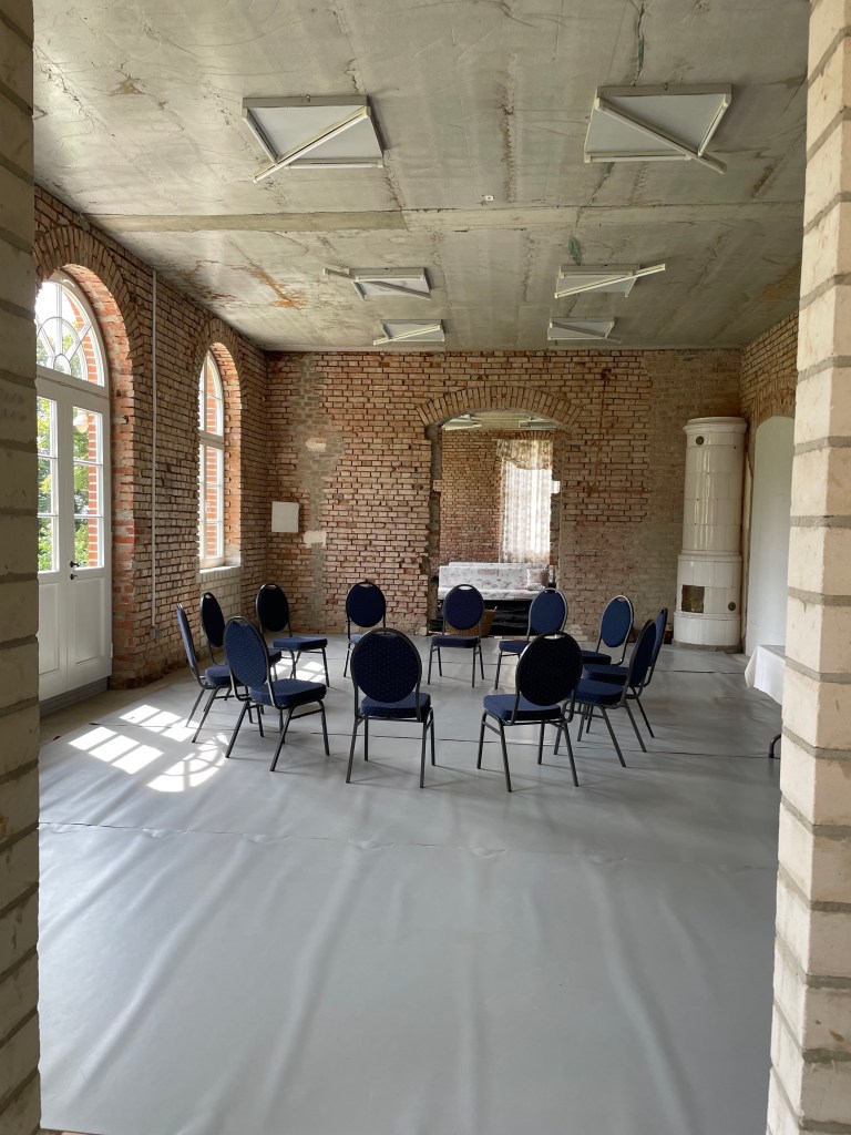 Claudia Bousset hat ein gutes Gespür für die guten und richtigen Orte für solche Workshops. Das Kranichhotel war wie eine Insel an diesen Tagen, ein wunderbarer Ort, um sich zurückzuziehen. Die Räume sind groß, individuell und offen, die Weite der Landschaft beruhigt. Das Hotel strahlt etwas Unfertiges aus, ohne dass irgendetwas fehlen würde. Regelmäßig residieren hier Künstler*innen, um zum Motiv des Kranichs zu arbeiten. Ihre Arbeiten sind im Kranichmuseum des Hotels zu bewundern.